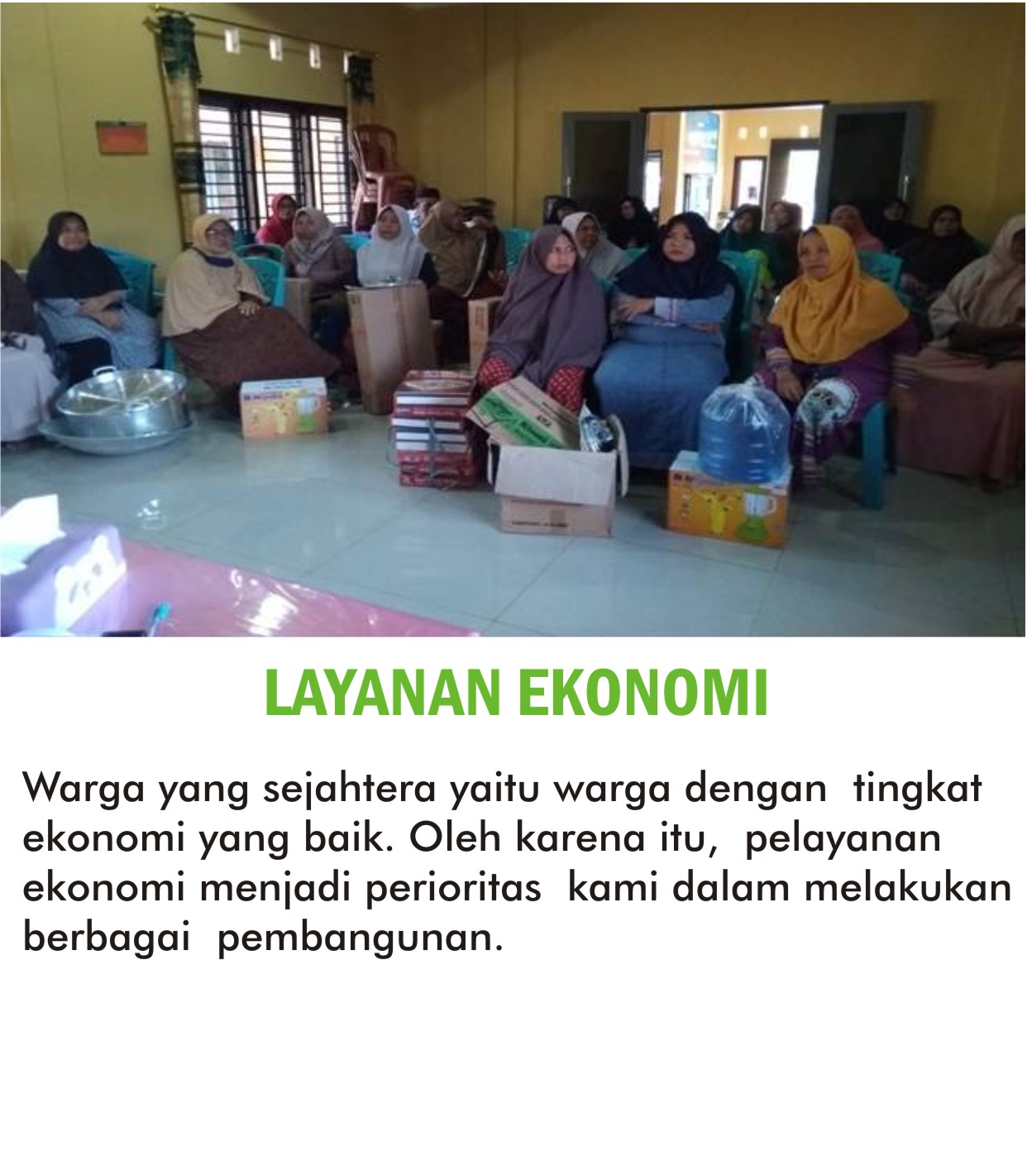 Warga yang sejahtera yaitu warga dengan tingkat ekonomi yang baik. Oleh karena itu, pelayanan ekonomi menjadi perioritas kami dalam melakukan berbagai pembangunan.